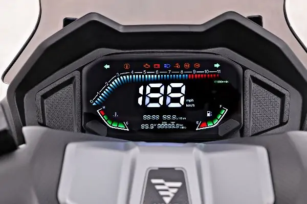 Υγρόψυκτος κινητήρας, δικάναλο ABS και TCS (σύστημα ελέγχου πρόσφυσης), ESS σύστημα προειδοποίησης απότομου φρεναρίσματος, KEYLESS, Dash Cam, έγχρωμη οθόνη LCD,